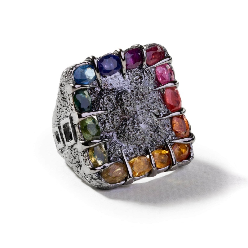Showcasing an array of fully natural, radiant rainbow sapphires, this singular designer piece defies conventional norms with Kabirski's hallmark gemstone setting method. It is not just a mere accessory; this freak is an art object that embodies the designe