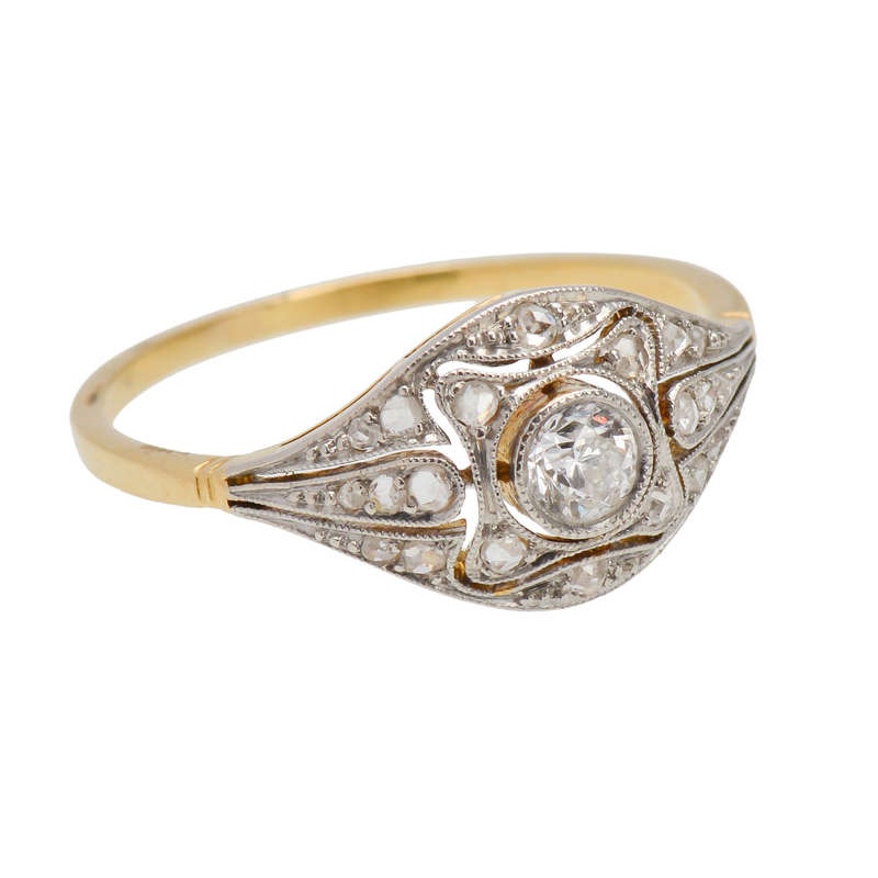 Who is this ring for? Our vintage lover who prefers low-profile, low sitting rings without prongs to catch or snag. A shimmering ring with no “bling”, it is antique but fine for everyday wear. Its two-color precocious metal blends with any other jewelry.