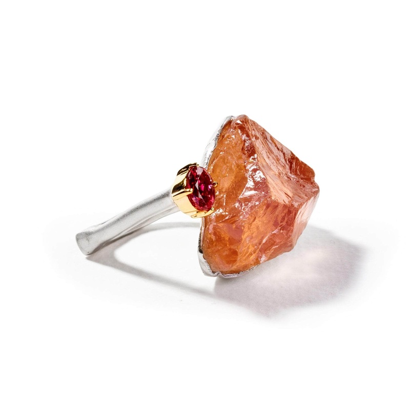 A singular designer silver ring that resemble the cosmic weight balance with the raw, unspoiled beauty of a rose quartz crystal on one side, as a tribute to the untamed forces of nature. On the other side, a perfectly polished oval-cut cabochon, gleaming with flawless beauty, hints at the artistry of human hands. This is a testament to the dynamic balance, where the raw and the refined unite, representing the very essence of the world’s perpetual motion.