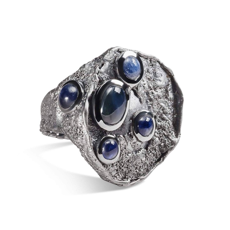 Emerging from the volcanically shaped surface of this black rhodium ring are a series of earthly blue sapphires. Their depth of color belies a magical presence that exudes mystery and glory. The rippled undulations below create a perfect landscape for such