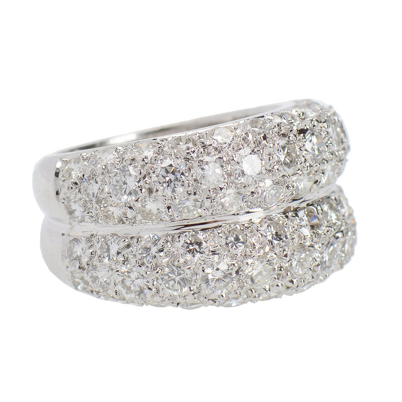 Double trouble? Not at all, more like double pleasure with 3.4 carats of diamonds encrusted this estate ring. What appears to be two stacked bands, in reality is one comfortable ring in 18k white gold. The entire upper surfaces are in a paveof diamonds. Wh