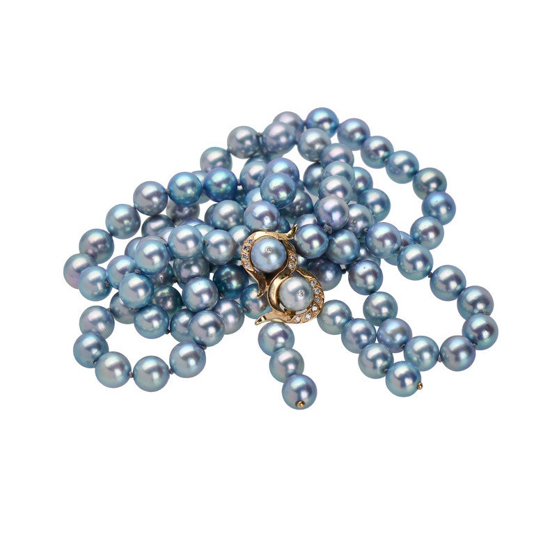 First that color…blue gray and lustrous, each of the 106 cultured pearls are a generous 7.5 mm on average. In a continuous strand of 33 inches, a gold and diamond clasp brooch (the doesn’t open) adds panache.