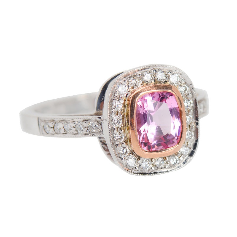 In peony pink with very fine clarity, this cushion cut blushing spinel weighs 1.3 carats. It is bezel set in a touch of yellow gold and then surrounded by a bevy of brilliant cut diamonds in a halo of light.