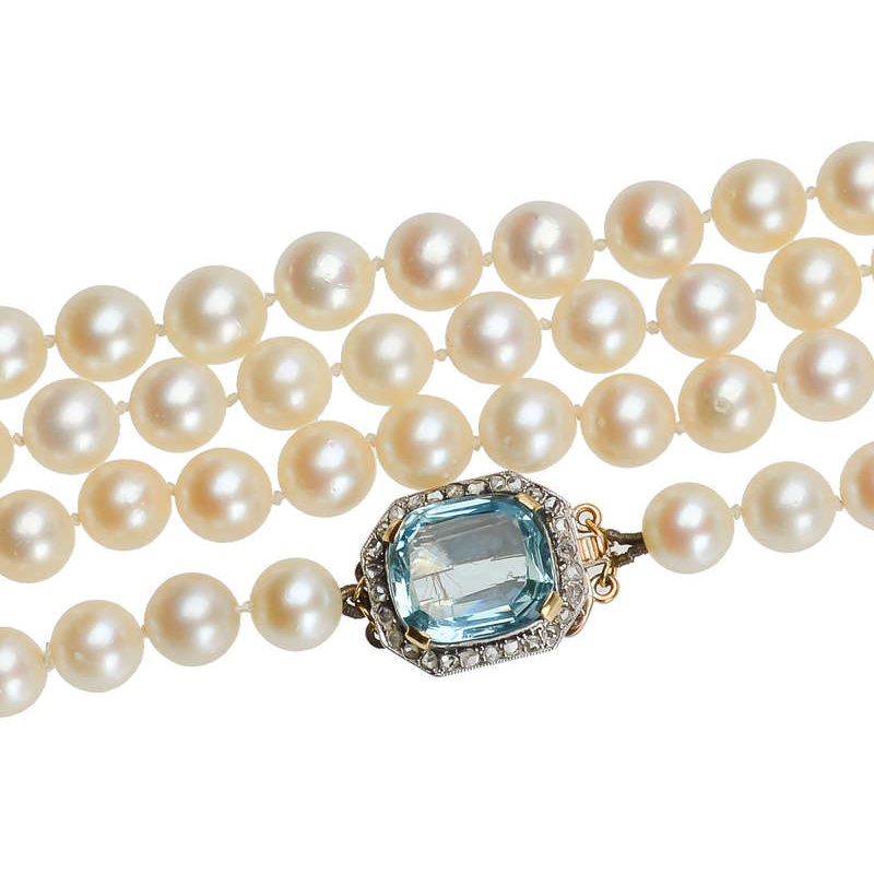 Aquamarine is the perfect compliment to luminescent pearls. The cool of the sky blue hues set off the snowy white pearls, one transparent and reflecting light, the other seemingly glowing from within.