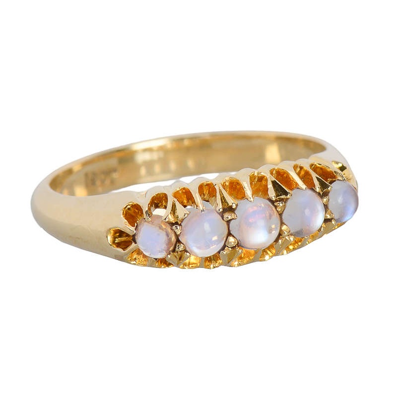 How five little gemstones can put out such distinct, cool blue sheen...well your guess. But these do.Each one glows with the ideal adularescence, it is a mystery how the icy "spots" move across the surfaces as the ring shifts in orientation. Small but migh