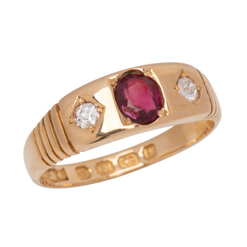 It is your chance to possess and wear a natural red, ruby ring from the year 1885 for an exceptional price point.An oval, unheated, natural deep red ruby rests gypsy set within 18k gold. At .40 carats in weight, it is nestled between two old mine cut diamo