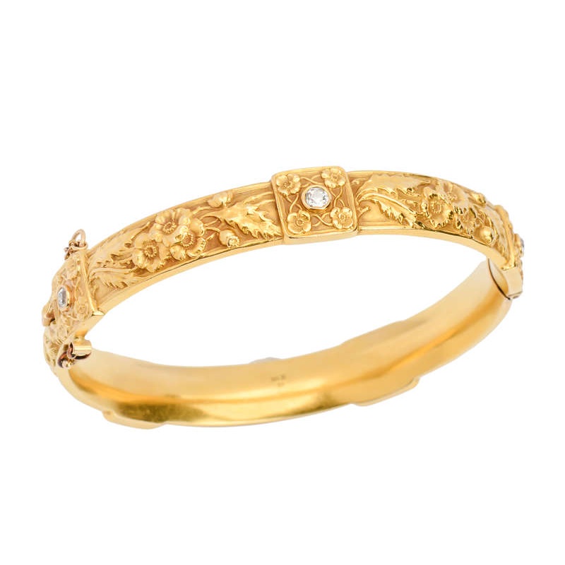 Exceptional Hinged Floral Motif Antique Gold Bangle