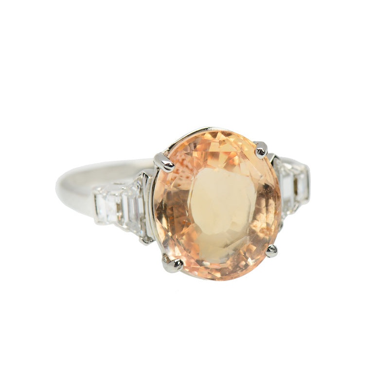 Spaulding & Co. is known for their use of exceptional gemstones and this platinum ring, featuring a no heat orange sapphire is a testament to that statement.Pale apricot hues with bright highlights characterize the 6.86 carat oval faceted no heat natural s
