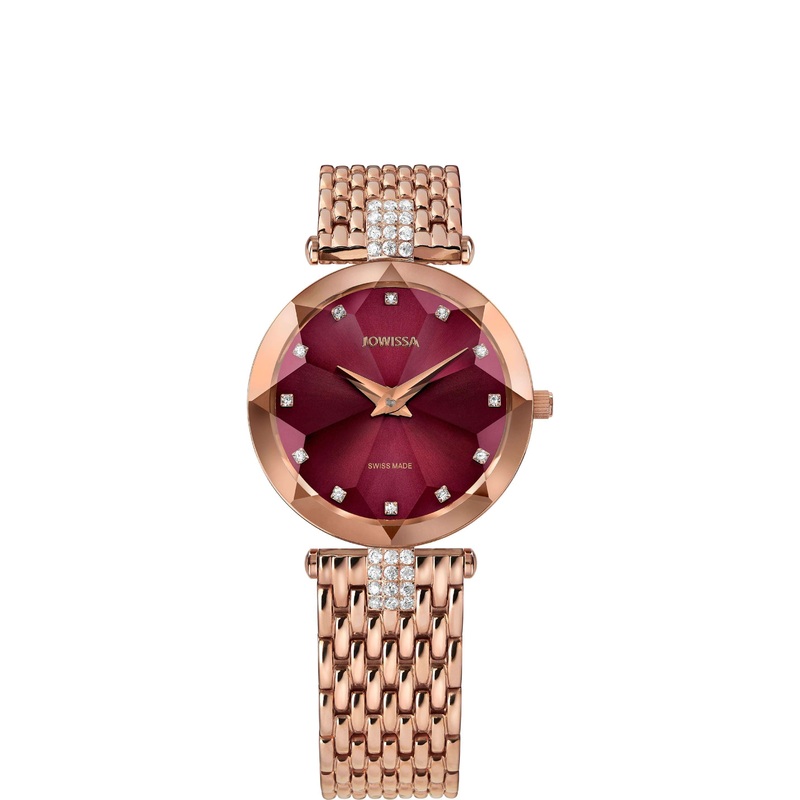 This gorgeous jewellery watch in rose gold looks divine on your wrist. Reliable as well as beautiful, this Swiss-made ladies watch has a burgundy sunray dial in 30mm diameter with extra sparkle created by faceted glass and glittering indices. The rose gold
