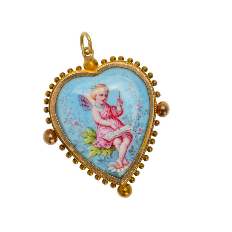 Fairies capture many an imagination and can transport us to unknown realms. One of the most charming is this Victorian example set in a gold heart. This exquisite image is rendered in hand painted enamel. A cherubic fairy sits all dressed in voluminous pin