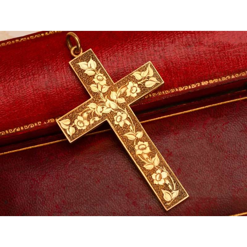 Metaphors often associated with the life of Jesus cover this splendid 18k gold antique cross.