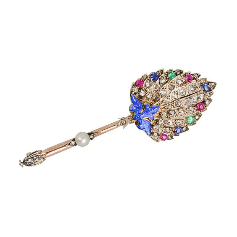 Thoroughly French and from the grand era of the Belle poque (circa 1880-1910), this glittering diamond and gem set brooches takes its inspiration from an ostrich feather fan.