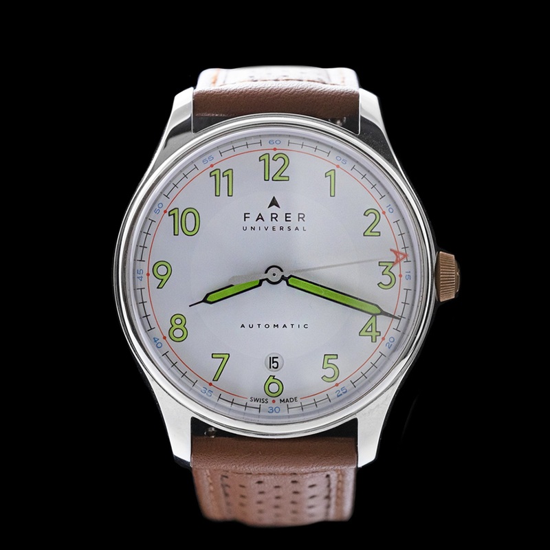 It has been nearly 3 years and this is the first Farer Universal we’ve had the pleasure to offer for sale. This three-hander is called the Beagle, for the HMS Beagle which was the ship used by our mate Charles Darwin. Playfully accented with non-lumed apple green indices and hands, this is an exciting watch.