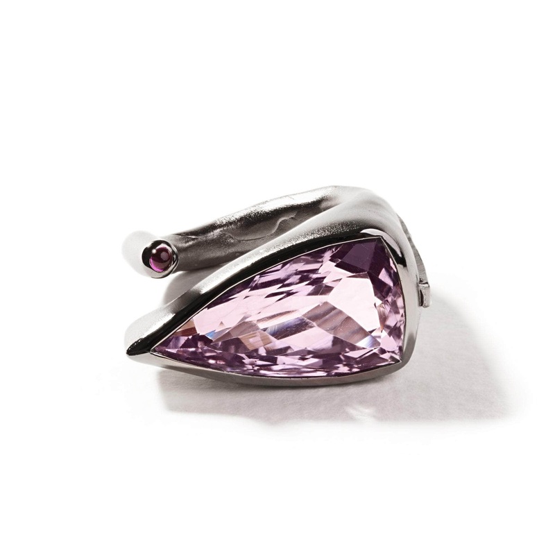 Crafted from 925 silver, this unusual contemporary ring is coated in black rhodium showcases a large magnificent pear-cut amethyst accompanied by a round-cut rhodolite garnet. Additionally, there’s a line of spinel melee on the side, adding a touch of oddity. This ring is a singular creation, so there’s no chance of accidentally twinning with someone else.