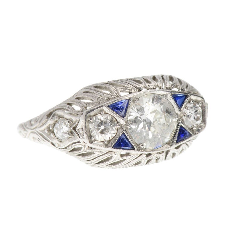 Four triangular synthetic sapphires (correct for the time period) punctuate the diamonds with geometry and color.