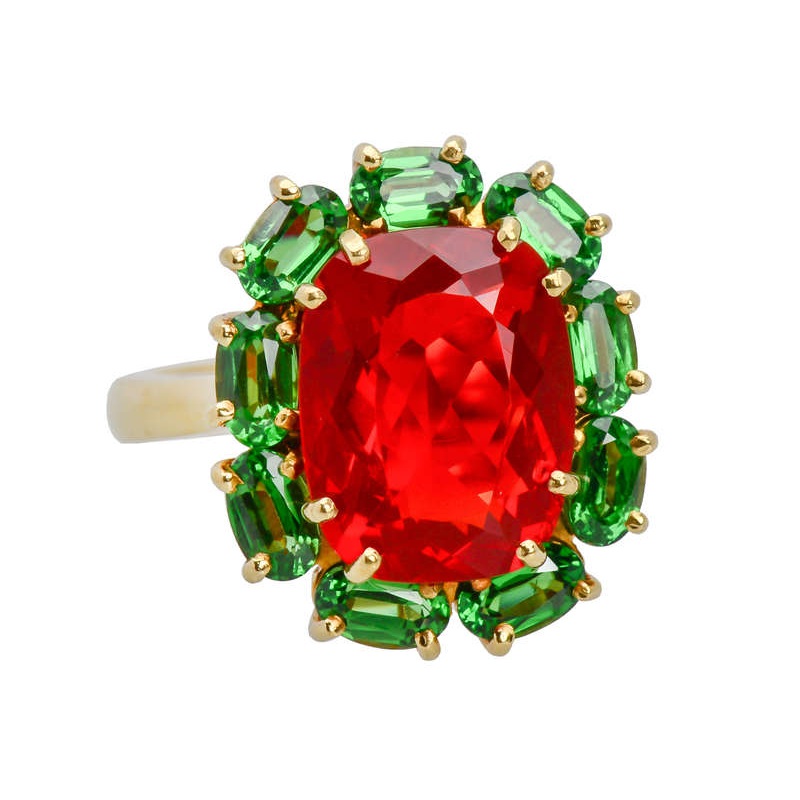 It is framed by twelve garden green tsavorite garnets that offset and compliment the opal.