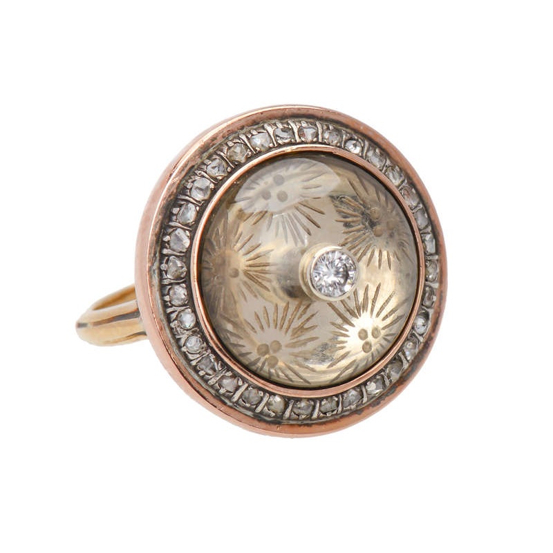 Like miniature fireworks, the rock crystal dome in this antique diamond ring has been etched underneath with tiny rays emanating from three dots.