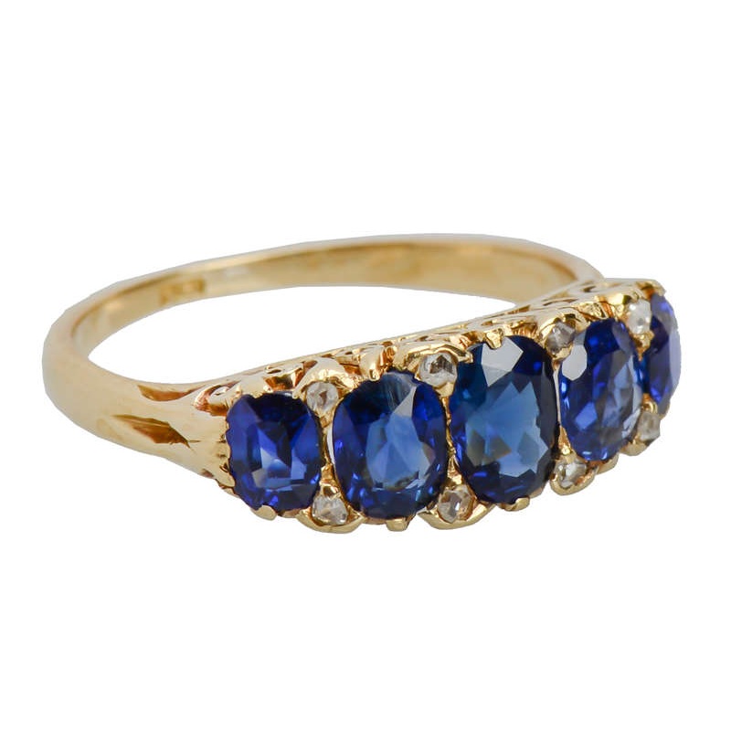 Royal, cobalt, and Prussian, all refer to a rich, resonant but distinct blue hue. Yet, these fine sapphires are pricked by flashing light blue highlights from every angle.Five in graduated sizes that span the finger, they and are punctuated by tiny diamond
