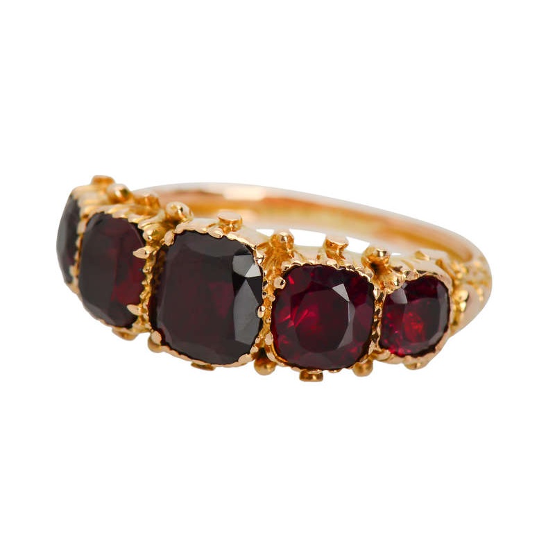 Dating to circa 1840-50, this five-stone garnet ring wraps the finger in a low profile, low set easy to wear ring.
