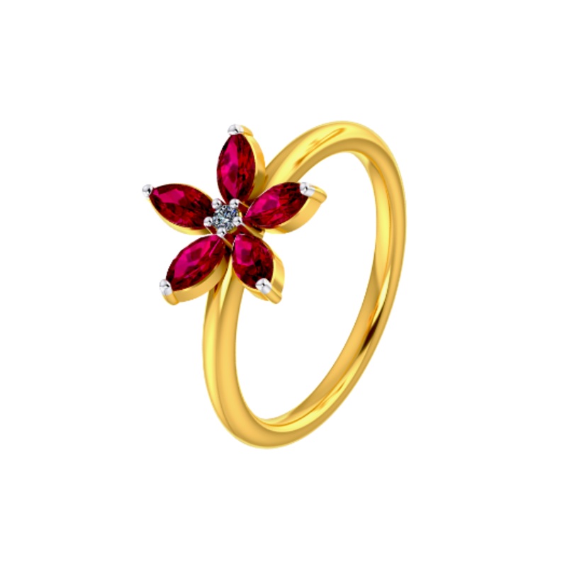 Crafted exclusively for you, this beautiful red stone studded floral themed gold ring design for women from our collection is a show-stealer for sure. The ring comes with a dimension of 1.179 CM X 1.179 CM X 1.179 CM, weighs 2.8 gm and bears BIS Hallmark c