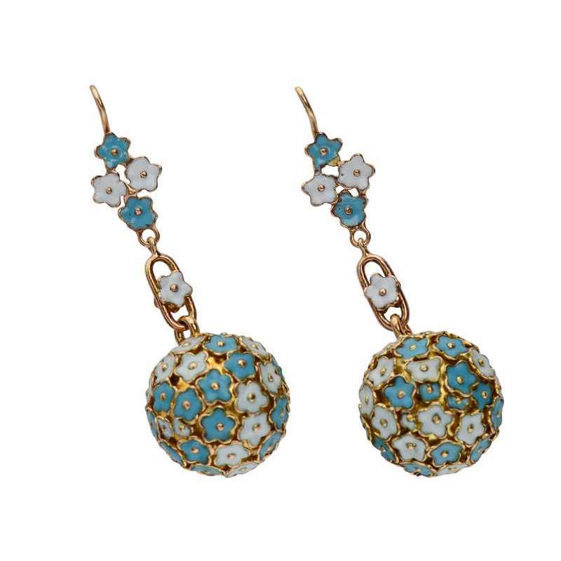 An orb or sphere dangles at the bottom and is covered all the way around with flowers as well. In 14k gold, sometimes this motif is seen but usually on brooches. Rarely have these been interpreted into earrings.
