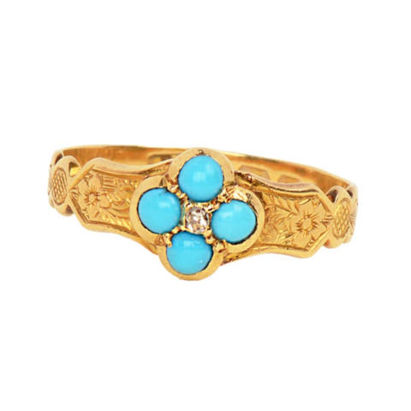 In the year 1901, this ring was lovingly created in the town of Birmingham, England. Petite, it is an artful blend of two types of flowers - one with four petals, in turquoise with a tiny diamond center; and two more engraved on each shoulder.Those flowers