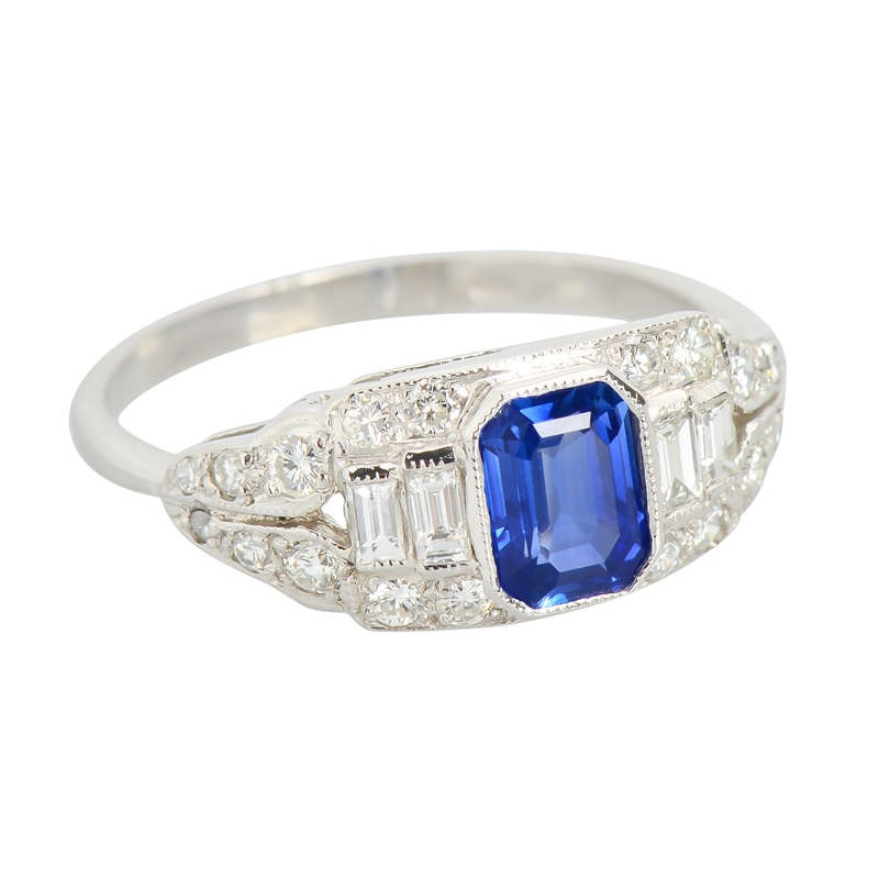 Art Deco in style, but created circa 1980, this natural blue emerald cut sapphire is bezel set for security. If you are going to wear a sapphire every day, this is the setting that you want.