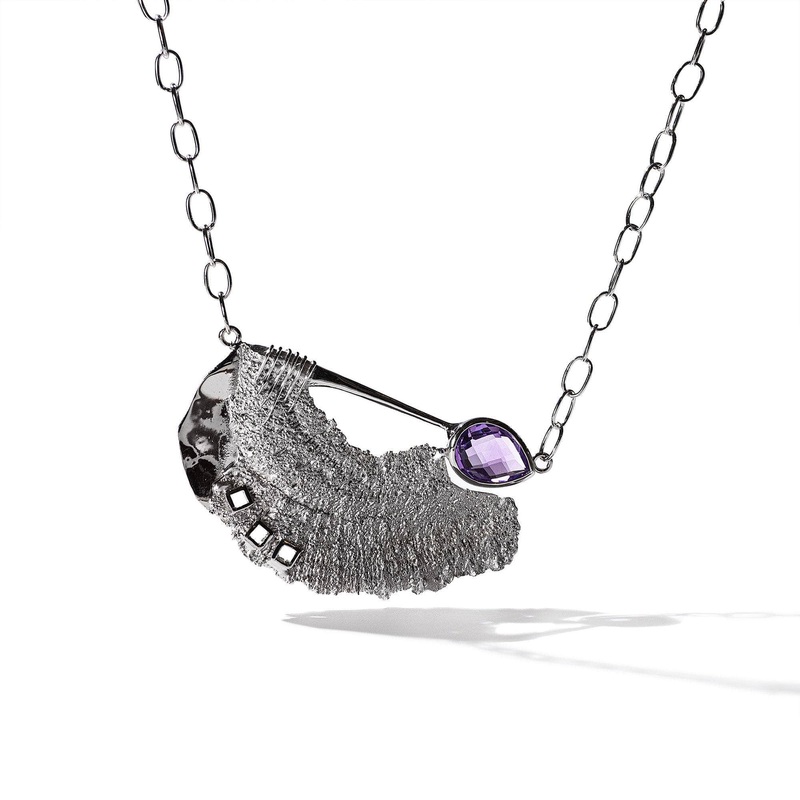 Presenting our new designer necklace, an odd piece of modern jewelry that is sure to impress and turn heads. Organic and random, this neckpiece’s unusual silver texture provides a tactile and visual sensory experience, contrasting with the bright color and perfectly polished surface of the natural amethyst gemstone. Crafted as a one-of-a-kind creation with no second copy available.