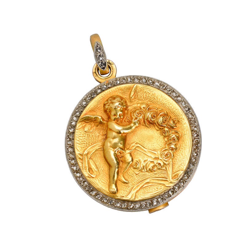 Condition, aesthetics and authenticity speak volumes in this breathtaking antique French cherub motif slide locket. Surrounded by tiny rose cut diamonds, the center round panel illustrates a winged cherub or angel cavorting with a garland of roses or flowe
