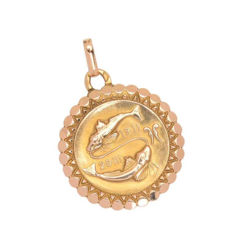 Masterful and replete with precise details, this pendant represents the Zodiac sign of Pisces and was created by the noted French jeweler, Charles Perroud.Mr. Perroud worked in France from the years of 1913 to 1949. These Zodiac medallions were created in