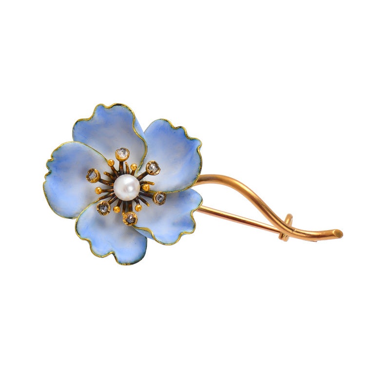 Its frilled five petals are undulating and scalloped with the center showing staccato but prominent center stamens. This pin is designed in 18k yellow gold and soft blue and white enamel. The use of shaded hand painted enamels serves to highlight the curvature and three dimensional lifelike quality of the blossom.