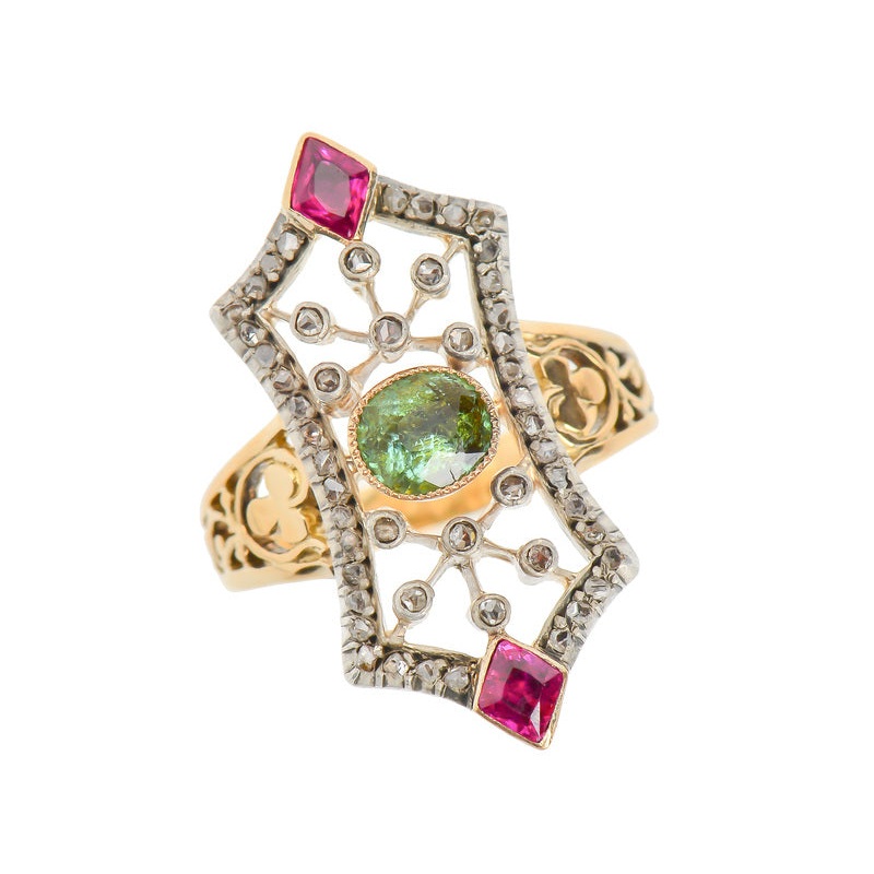More rose cut diamonds provide a glittering perimeter. An oval faceted mint green emerald of .60 carats is set centermost and plays counterpoint to two fancy cut diamond shaped rubies of a total of .40 carats.