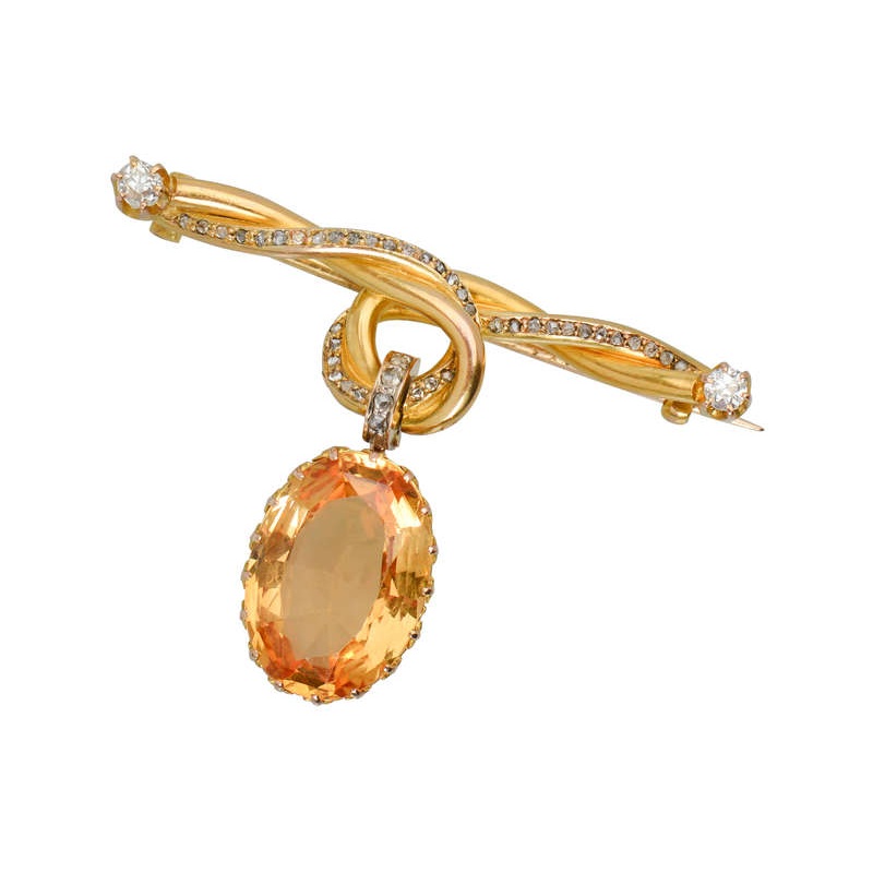 Peach and golden hues play their visual chords in this stellar imperial topaz set brooch. Oval in shape and faceted, it is sumptuous 9.8 carats! Topaz, especially imperial and precious ones, have become so desired and expensive that this is a rare treat. R