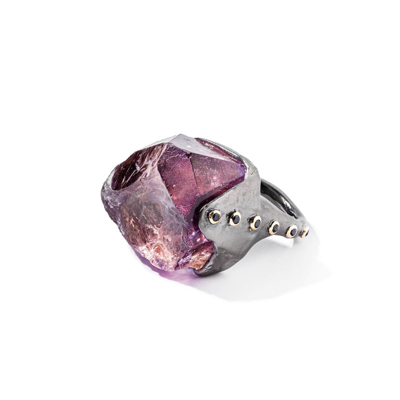 The massive rough amethyst crystal, left unaltered in its natural state with a supernatural life inside, is a striking focal point of the ring, sure to catch the eye of anyone who sees it. Handcrafted as a single piece of 925 Silver plated with Black Rhodium and 18K Gold, it has an additional artistic and collector’s worth valued by contemporary jewelry lovers.