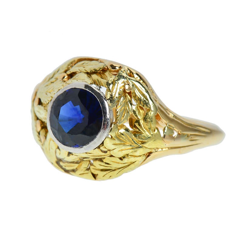 This unmistakably gorgeous 14k yellow gold Arts & Crafts ring has been set with a deep and resonant round cut and faceted sapphire of .80 carats. While lush cobalt blue, it retains subtle highlights, firmly placing it in the blue family (not inky or black).
