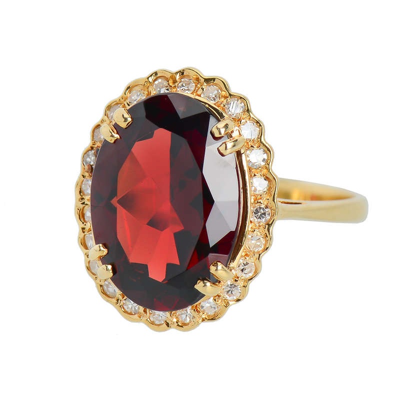 Warmth and fire radiate effortlessly in this Edwardian style halo ring. An oval faceted pyrope garnet oval of 5.8 grand carats gleams with an inner light and bright, hot highlights.