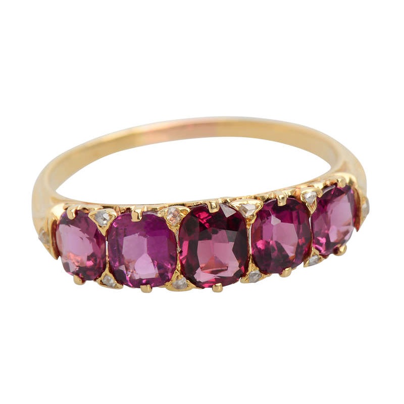 Line up the color with purple and pink rhodolite garnets. Five in all, oval and faceted in shape, resonate with their characteristic shades of plums and rose pinks. Their total weight comes in at 2.45 carats.Between sit dainty rose cut diamonds along with