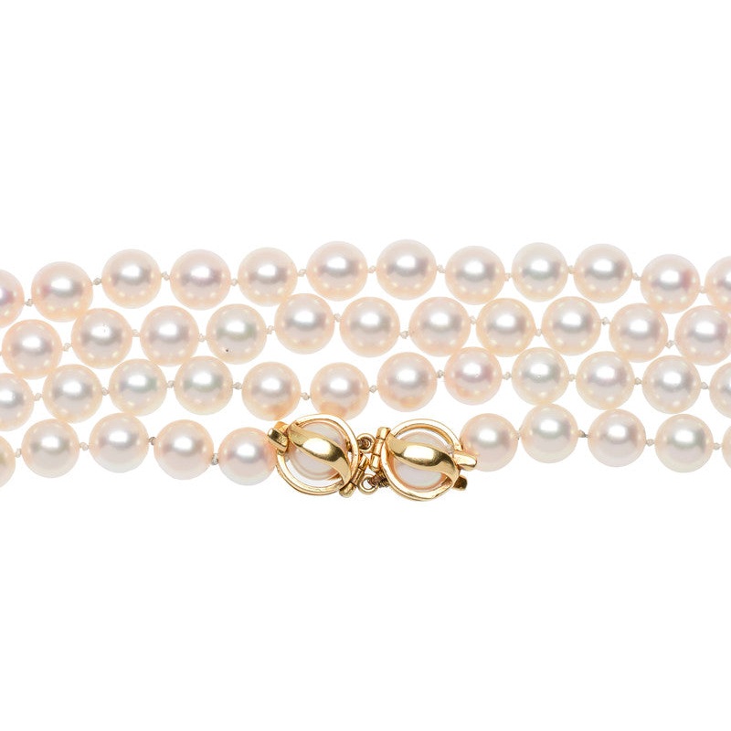 Each pearl has a diameter of over 7 mm with an excellent spherical shape and a thick nacre. The well matched 32 inch necklace is versatile. It has ingenious clasps which enable the strand to be worn in any number of ways, such as a long single strand, double strand or the back as a single strand and the front doubled.