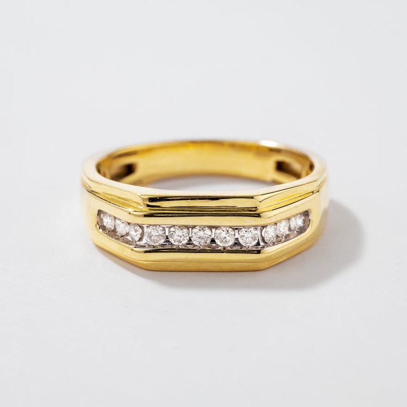 This extraordinary gents diamond ring is formed in 10K yellow gold with a mix of brushed and high polish finish. This unique diamond band holds 11 round brilliant diamonds that are aligned in a true channel setting. Total diamond weight is 0.25 carats. Also available in 10K white gold.