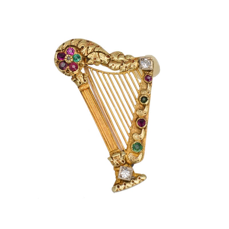 Exquisite in every way, this acrostic Georgian period brooch takes the form of a floor harp.