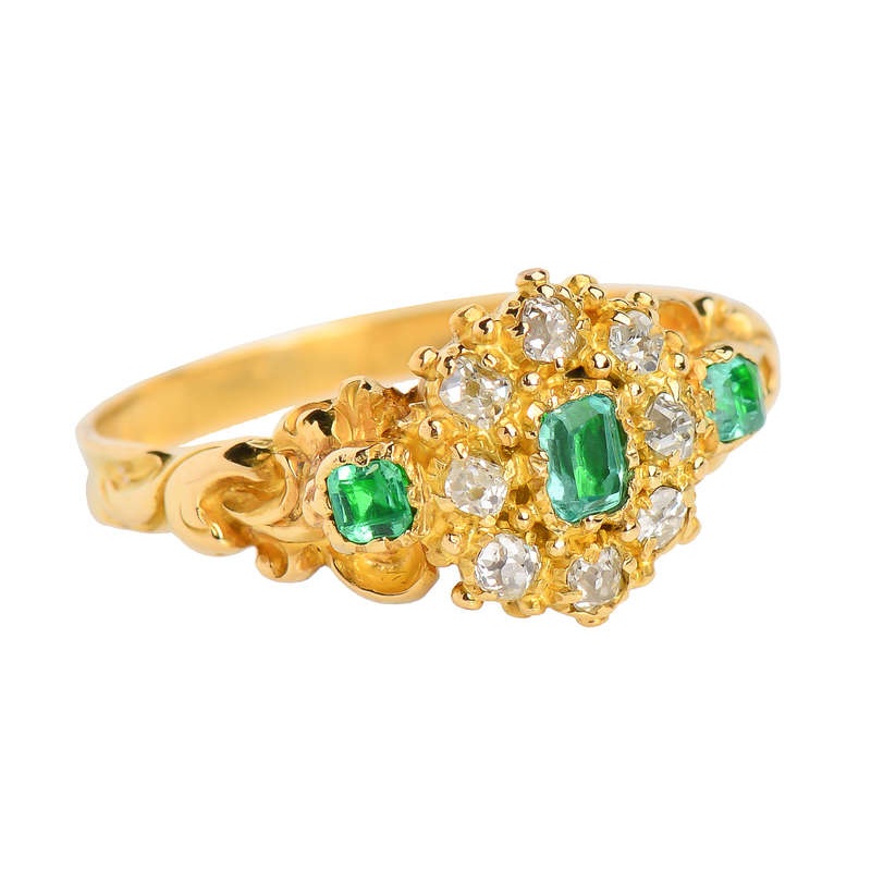 Three beautiful rectangular cut natural emeralds (a total of .22 carats) with fine coloration and clarity have been placed in delicately scalloped collets to create an ornate backdrop. In a cluster or halo formation, eight glittering old mine cut diamonds act as their companions, their total weight is .48 (color G-H, clarity SI1-3).