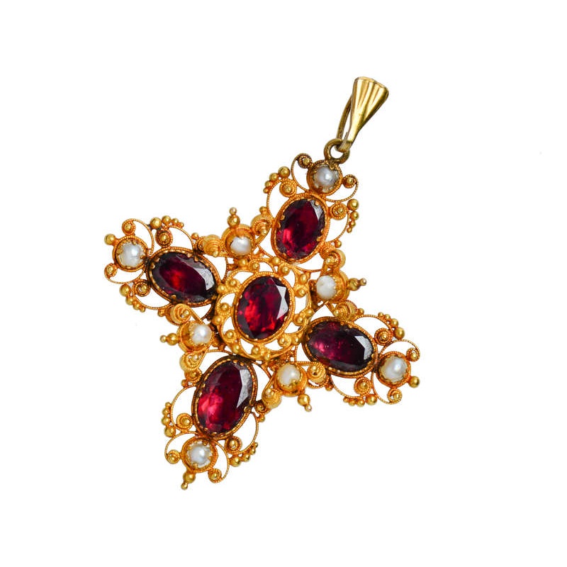 Set with five oval faceted almandine garnets, their hue ranges from wine red to deep purple. Each is set closed backed and foiled beneath. In 15k yellow gold, eight natural freshwater pearls dot the surfaces.