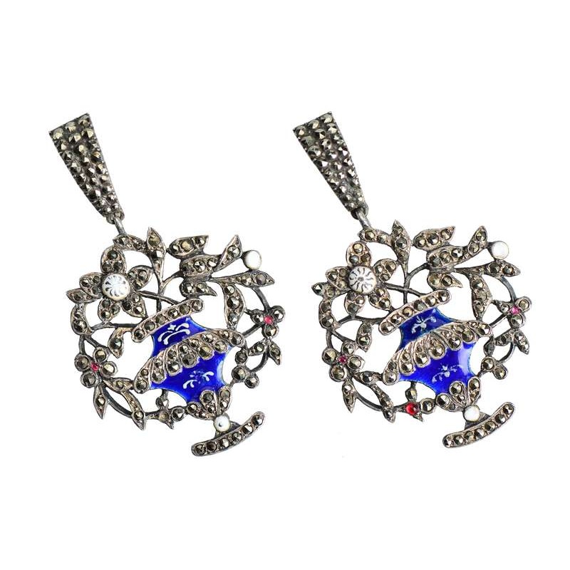 These earrings are fashioned in two parts. The surmount is a graduated convex surface studded with marcasites (or pyrites). The drop is an exceptionally lyrical vase with a bouquet of flowers.
