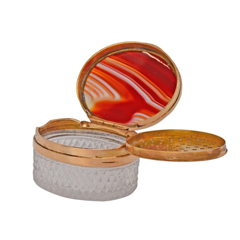 Involving several senses, this Georgian-era gold vinaigrette reminds us to savor the moment.In 9k rose gold, banded agate, and intricately cut glass, this vinaigrette box dates to around 1800.Its top is a swirl of partially translucent polished carnelian,