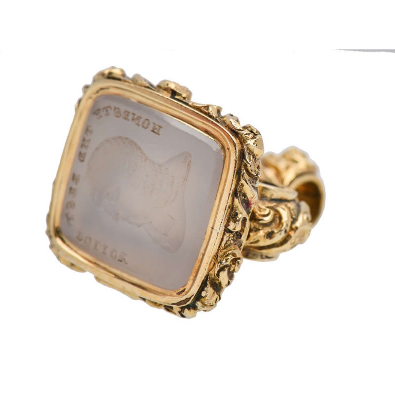 A white chalcedony agate is carved in intaglio with the words, “Honesty The Best Policy” surrounding a judge or barrister head in profile, attired in full-bottomed wig and cloak with traditional white tie.