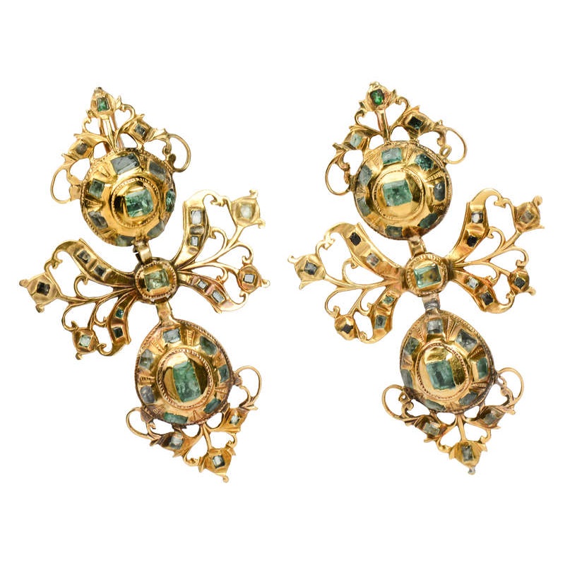 These fantastic emerald earrings are Spanish or Portuguese in origin and are classic examples of the pendeloque. See “Earrings from Antiquity to the Present” by Daniela Mascettti and Amanda Triossi on pages 55 and 63 for two near-exact matches.
