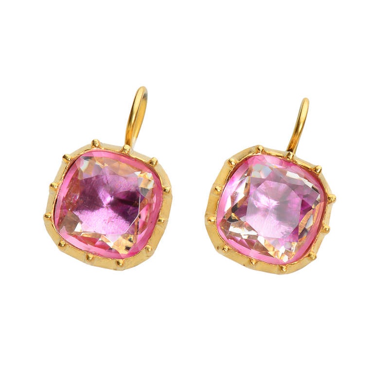 A take-off on the ever desirable Georgian paste solitaire earrings, these pretty-in-pink rock crystal versions are destined to be part of your favorite cache of jewelry.Luminous in sparkle and shifting from deeper peony pink to sea shell hues, the rock cry