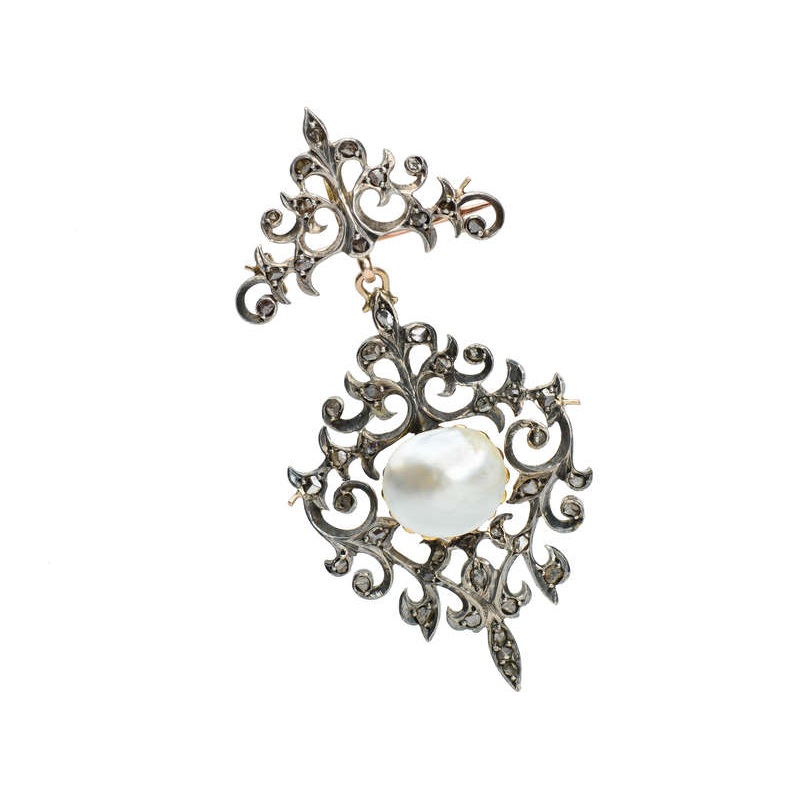 It’s dangle presents with more open work and stylized floral and scrolling designs, all dotted with diminutive naive rose cut diamonds. At the center is a golden base that holds a mabe domed pearl.