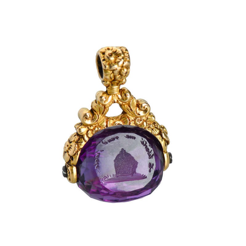 Dating to circa 1830, this English fob seal was meticulously carved in amethyst and crafted in 18k yellow gold. It has three separate seal surfaces and the entire gemstone rotates or spins.