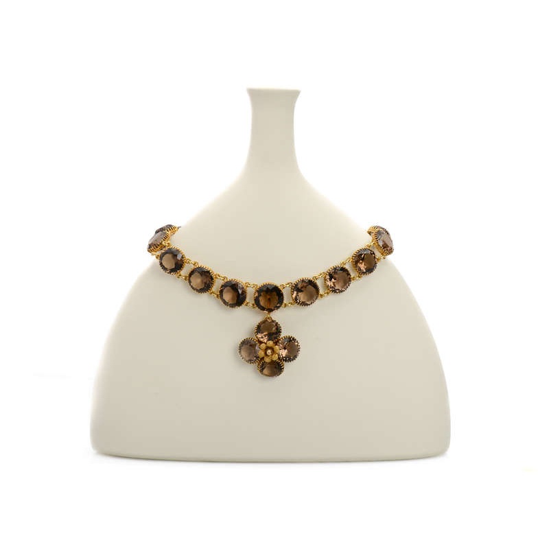 One hundred and forty-three carats (143) of mink-hued smoky quartz are artfully faceted to sparkle and refract.